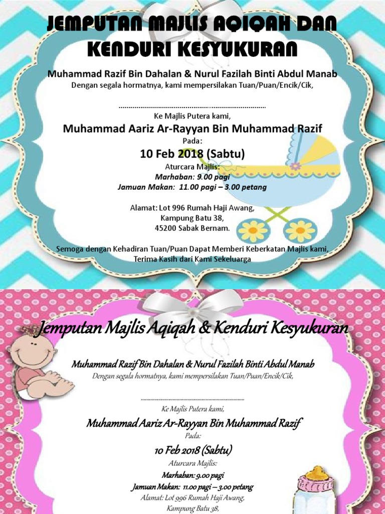 Jemputan Majlis Aqiqah, Kesyukuran & Cukur Jambul | Wak ... from 4.bp.blogspot.com 25 februari 2011 masa : Fb saya kad tempahan pelbagi. Pada 30 sept 2012, dari pukul 12 tengah hari hingga 5 petang. Contoh kad jemputan majlis cikgu habibah smkis in 2019 projects. Contoh ayat jemputan majlis kesyukuran di whatsapp. Terima kasih kepada ketua pegawai eksekutif yusri maju group, en. Contoh ayat jemputan majlis kesyukuran whatsapp. Kehadiran tuan/puan nanti amat kami hargai.